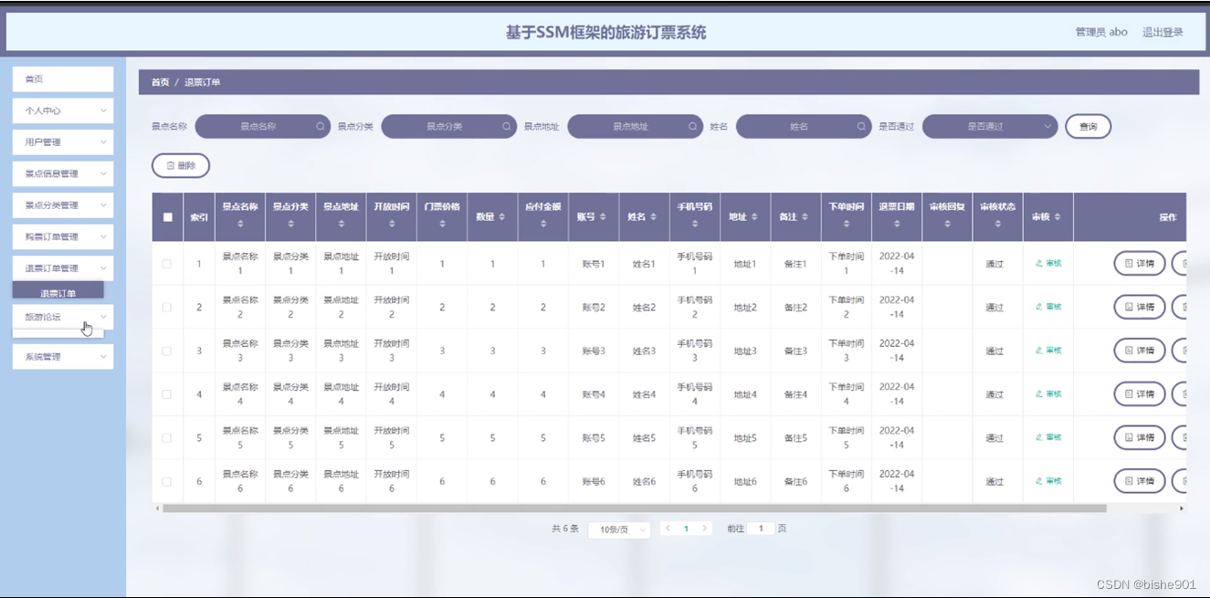 退票订单管理,在退票订单管理页面可以对索引,景点名称,景点分类,景点地址,开放时间,门票价格,数量,应付金额,账号,姓名,手机号码,地址,备注,下单时间,是否支付,审核回复,审核状态,审核等内容进行详情,审核和删除等操作,如图5-11所示。