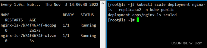 - kubect1 scale deployment nginx-ls --replicas=2 -n kube-public 扩容