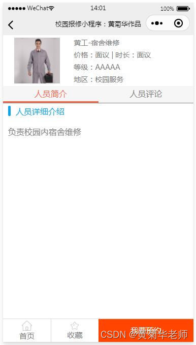 人员详情:显示工作人员的头像、价格、服务、介绍等