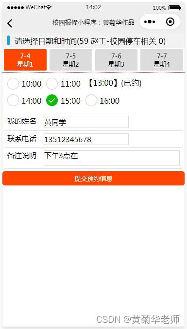 人员预约:选择日期,选择时间点,填写预约姓名、电话、备注等提交