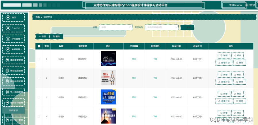 知识学习管理,在知识学习管理页面可以对索引、标题、课程类型、图片、学习视频、相关资料、发布日期、教师工号等内容进行详情,修改,查看评论和删除等操作,如图5-13所示。