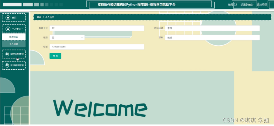 个人中心,在个人中心管理页面可以对教师工号、教师姓名、性别、职称、电话等内容进行修改操作,如图5-18所示。