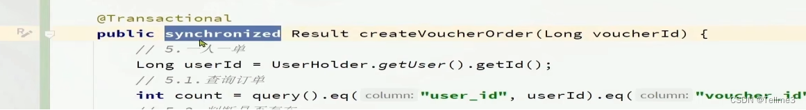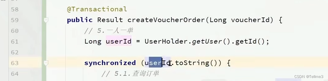 思路:我们缩小锁的范围,(我们只锁我们的用户id从而锁住我们的用户)一人一单中,我们只有在同一个用户来的时候我们才进行判断了(他的并发安全问题),其他用户我们就不加锁了。我们就使用关键字这种方法了(syn)锁住这个id再将下面的加在代码块中。