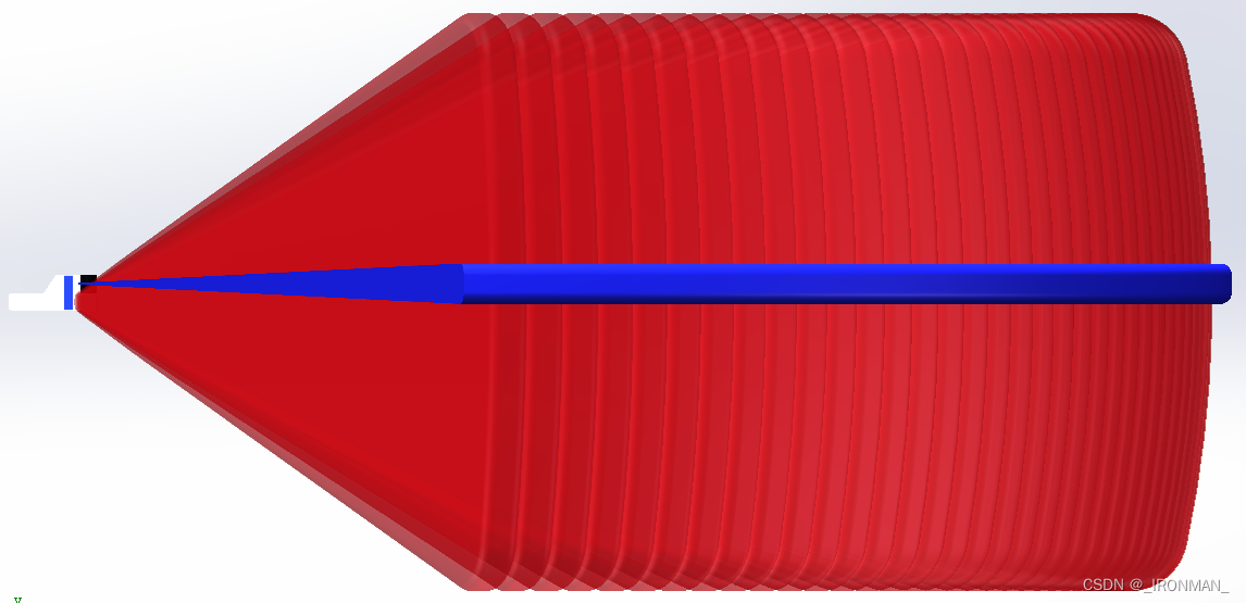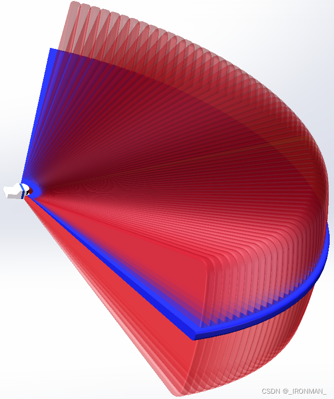成像声呐的是收发分置形式的,因此发射和接收波束形式都不一样,如图3所示,红色的为接收波束,由多个在水平方向很窄的(一般1°以下),保证在水平方向上有很高的分辨力,垂直方向很宽的波束构成(一般120°以上),保证能够接收足够宽的接收范围。一般数量为128、256、512、1024等的。蓝色的为发射波束,为一个水平(一般120°以上)和垂直方向较宽(一般10°~30°的范围)的波束构成。它们的重叠区域就是成像声呐的成像区域。