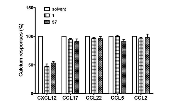鉴于化合物 57 是一个含有嘧啶酮结构的全新分子,又进一步进行了三方面的评价:(1)嘧啶酮结构的 Michael 加成受体反应活性;(2)与 CXCL12 的结合活性;(3)对其它趋化因子的选择性。化合物 57 和 1 的 Michael 加成受体反应活性采用加入 GSH 的方式进行评价,LC-MS 分析显示化合物 57 的反应活性明显低于 1。结合力实验测试表明,化合物 57 与 CXCL12 的解离平衡常数(Kd)为 780 nM,与之前采用 FRET 实验测得的 Ki 值(267 nM)在同一数量级。选择性评价(图5)显示,化合物 1 和 57 对其它趋化因子均具有较好的选择性。