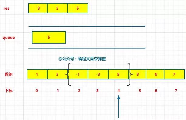 此时下标对应的数值为 5,5 分别大于 -1 和 -3,所以 -1 和 -3 出队列,5 入队列,此时的最大值为 5。