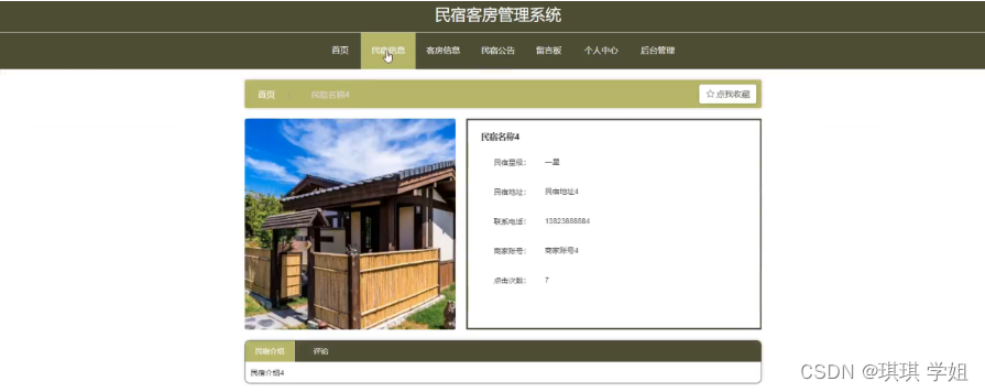 民宿信息,在民宿信息页面可以查看民宿名称,民宿星级,民宿图片,民宿地址,联系电话,商家账号,点击次数,民宿介绍等内容,并进行评论,收藏操作,如图5-3所示。