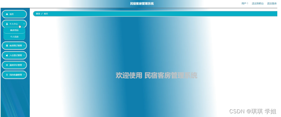 用户登录进入民宿客房管理系统可以对首页,个人中心,客房预订管理,入住登记管理,退房评价管理,我的收藏管理等进行相应操作,如图5-16所示。
