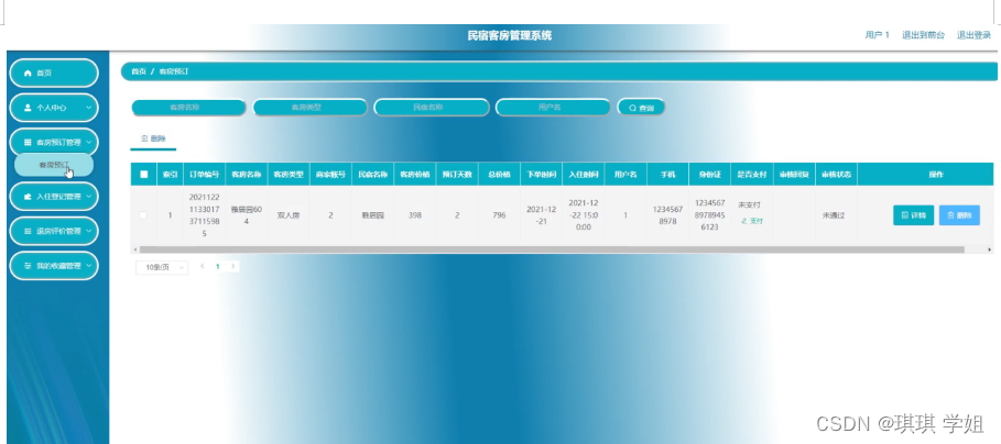 客房预订管理,在客房预订管理页面可以对索引,订单编号,客房名称,客房类型,商家账号,民宿名称,客房价格,预订天数,总价格,下单时间,入住时间,用户名,手机,身份证,是否支付,审核回复,审核状态等内容进行详情,删除等操作,如图5-17所示。