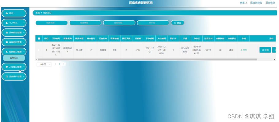 客房预订管理,在客房预订管理页面可以对索引,订单编号,客房名称,客房类型,商家账号,民宿名称,客房价格,预订天数,总价格,下单时间,入住时间,用户名,手机,身份证,是否支付,审核回复,审核状态,审核等内容进行详情操作,如图5-14所示。