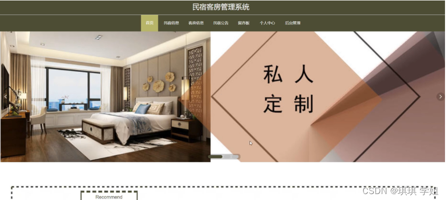 民宿客房管理系统,在系统首页可以查看首页,民宿信息,客房信息,民宿公告,留言板,个人中心,后台管理等内容,并进行详细操作,如图5-1所示。