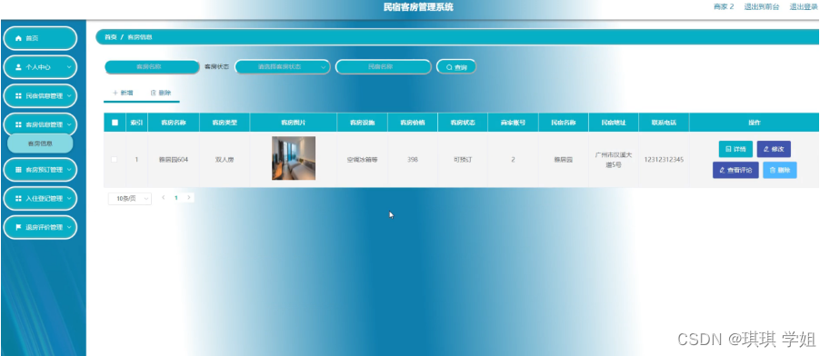 客房信息管理,在客房信息管理页面可以对索引,客房名称,客房类型,客房图片,客房设施,客房价格,客房状态,商家账号,民宿名称,民宿地址,联系电话等内容进行详情,查看评论,修改和删除等操作,如图5-13所示。