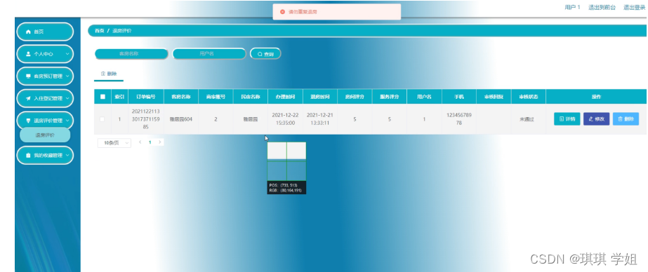 退房评价管理,在退房评价管理页面可以对索引,订单编号,客房名称,商家账号,民宿名称,办理时间,退房时间,房间评分,服务评分,用户名,手机,审核回复,审核状态等内容进行详情,修改和删除等操作,如图5-18所示。