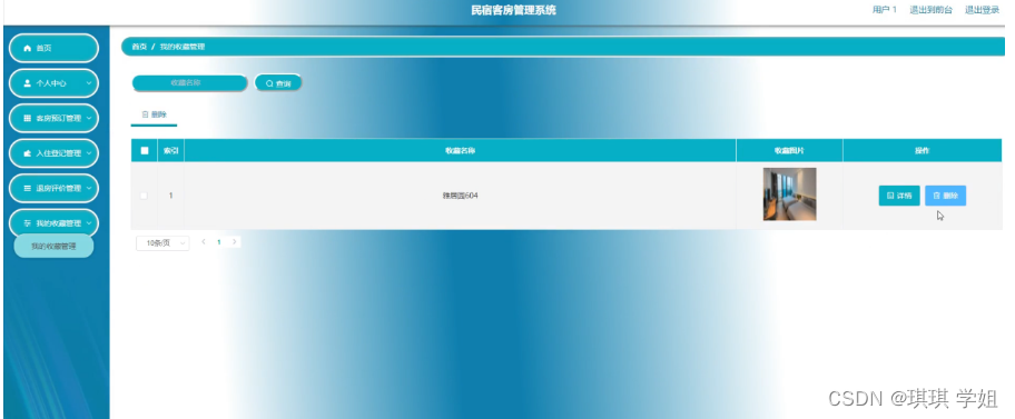 我的收藏管理,在我的收藏管理页面可以对索索引,收藏名称,收藏图片等内容进行详情,删除等操作,如图5-19所示。