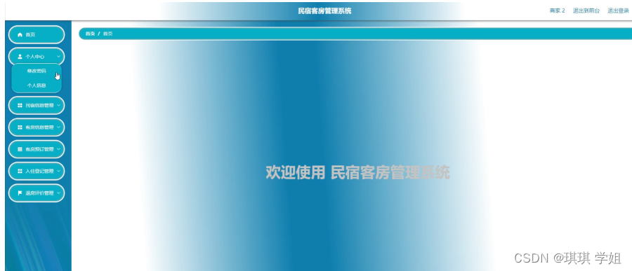 商家登录进入民宿客房管理系统可以对首页,个人中心,民宿信息管理,客房信息管理,客房预订管理,入住登记管理,退房评价管理等进行相应操作,如图5-12所示。