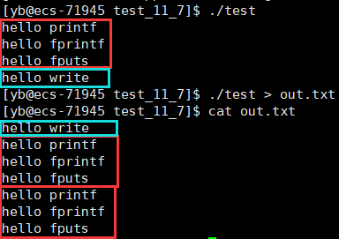 也很好理解,在C语言学习时我们就知道,如果printf输出的时候没有\n进行换号,默认不会刷新缓冲区,如果中间一直不出现刷新,会等到缓冲区满或者进程退出的时候再刷新,所以我们这里的hello printf一直等到进程退出的时候才刷新到屏幕