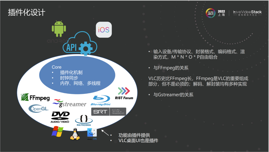 VLC的架构建立在插件化的基础上,其核心很小,仅提供内存管理、网络基础操作、多线程封装和时钟同步等功能,其它例如输入设备、传输协议、封装格式、编码格式、渲染方式等都是通过插件实现的,是M*N*O*P的自由组合方式。