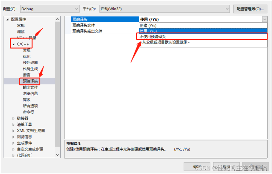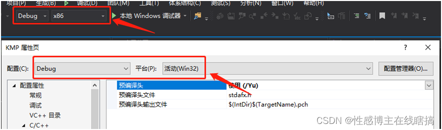 如果我们只想自己写头文件,可以关闭预编译头的使用,点击“项目”->“属性”打开项目属性: