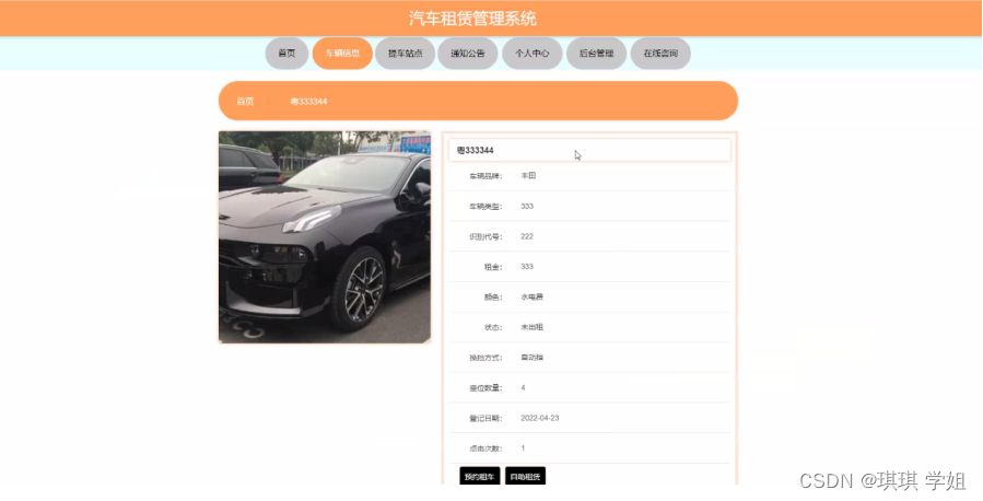 车辆信息,用户可在车辆信息页面查看车牌号、车辆品牌、车辆图片、车辆类型、识别代号、租金、颜色、状态、换挡方式、座位数量、登记日期、点击次数等内容,还可进行预约租车或自助租赁等操作,如图5-4所示。