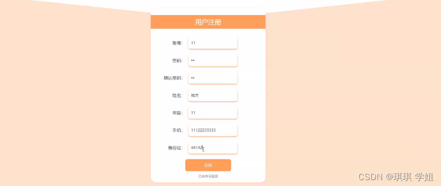 用户注册,用户通过输入账号、密码、姓名、年龄、手机、身份证等内容进行注册,如图5-2所示。
