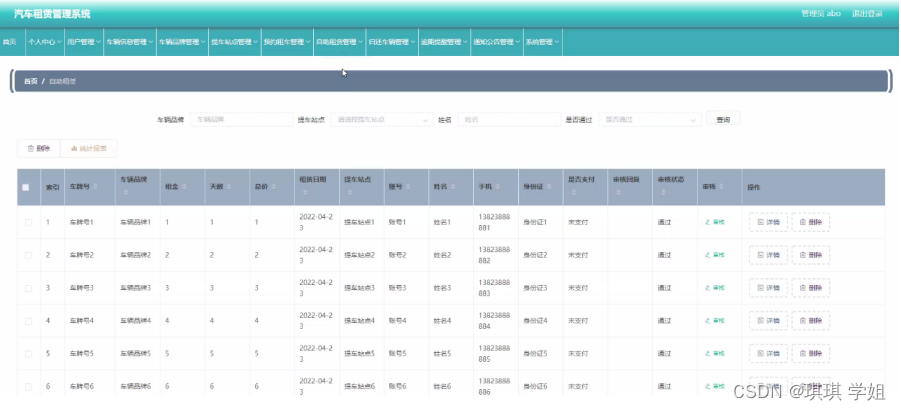 自助租赁管理,管理员可在自助租赁管理页面查看车牌号、车辆品牌、租金、天数、总价、租赁日期、提车站点、账号、姓名、手机、身份证、是否支付、审核回复、审核状态等内容,还可进行审核、统计或删除等操作,如图5-15所示。