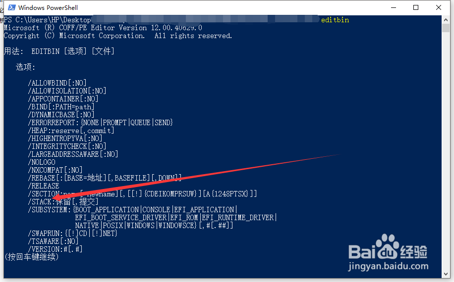 在打开的命令窗口中输入editbin,回车可以看到使用方法。期中/STACK可以修改程序栈大小。(如果没有该程序,请自行搜索下载)