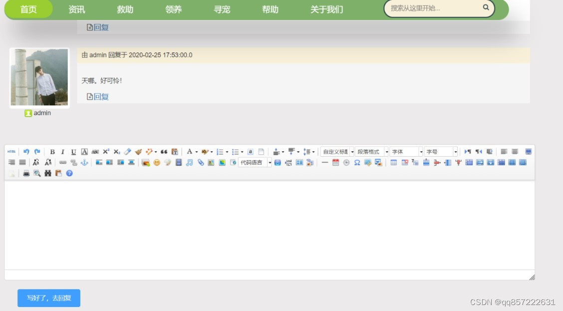 开发流浪动物救助平台,游客可以在页面浏览救助、寻宠、领养、咨询等各种信息,也可以注册成为平台用户。注册用户具备信息发布和评论留言的功能,可以发布寻宠、领养、救助等信息,通过管理员的后台审核之后,就可以展示在页面上。而管理员端则可以对所有的注册用户进行增、删、改、查、修改密码等基础操作。同时对于注册用户发布的信息、评论留言等可以进行审核、修改、删除等操作。平台的主要意义是为流浪动物的救助信息、丢失宠物的寻找信息等进行发布共享,让更多的爱心人士参与到救助中来。