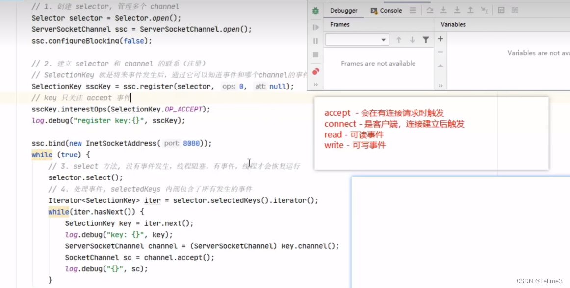 第二步:将channel注册到selector(这个channel还必须是非阻塞的,即channel.configureBlocking(false))注册用的channel.register(selector,对什么感兴趣,)