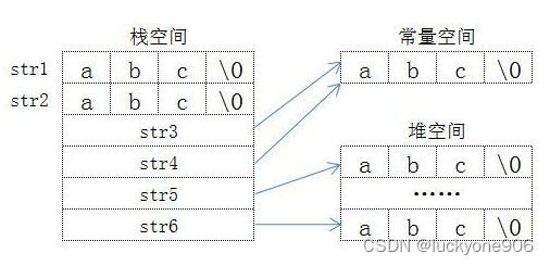 char str1[] = "abc";// 字符串存储在栈中char str2[] = "abc";char* str3 = "abc";// 字符串存储在常量区char* str4 = "abc";// 严格的写法应该是 const char* str4 = "abc";char* str5 = (char*)malloc(4);// 字符串存储在堆中char* str6 = (char*)malloc(4);str4[0]='x'; // 编译错误