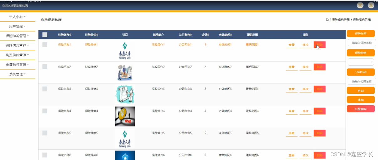 保险信息管理,在保险信息管理页面可以对保险名称,保险种类,封面,保险简介,公司名称,金额,有效时间,理赔范围等信息进行查看,修改和删除等操作,如图5-9所示。