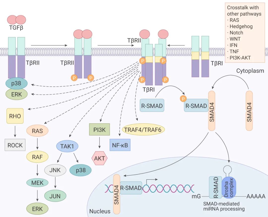 在非经典途径中,TGFβ 受体复合物通过其他因子传递信号,如 TRAF4 或 TRAF6、TAK1、p38 MAPK、RHO、PI3K-AKT,ERK、JNK 或 NF-KB,间接参与细胞凋亡、上皮-间充质转化、迁移、增殖、分化和基质形成等。