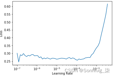 请注意,该图与我们使用随机权重时略有不同:我们没有表明模型正在训练的急剧下降。那是因为我们的模型已经被训练过了。在这里,我们在急剧增加之前有一个稍微平坦的区域,我们应该在急剧增加之前取一个点——例如,1e-5。具有最大梯度的点不是我们在这里寻找的,应该被忽略。