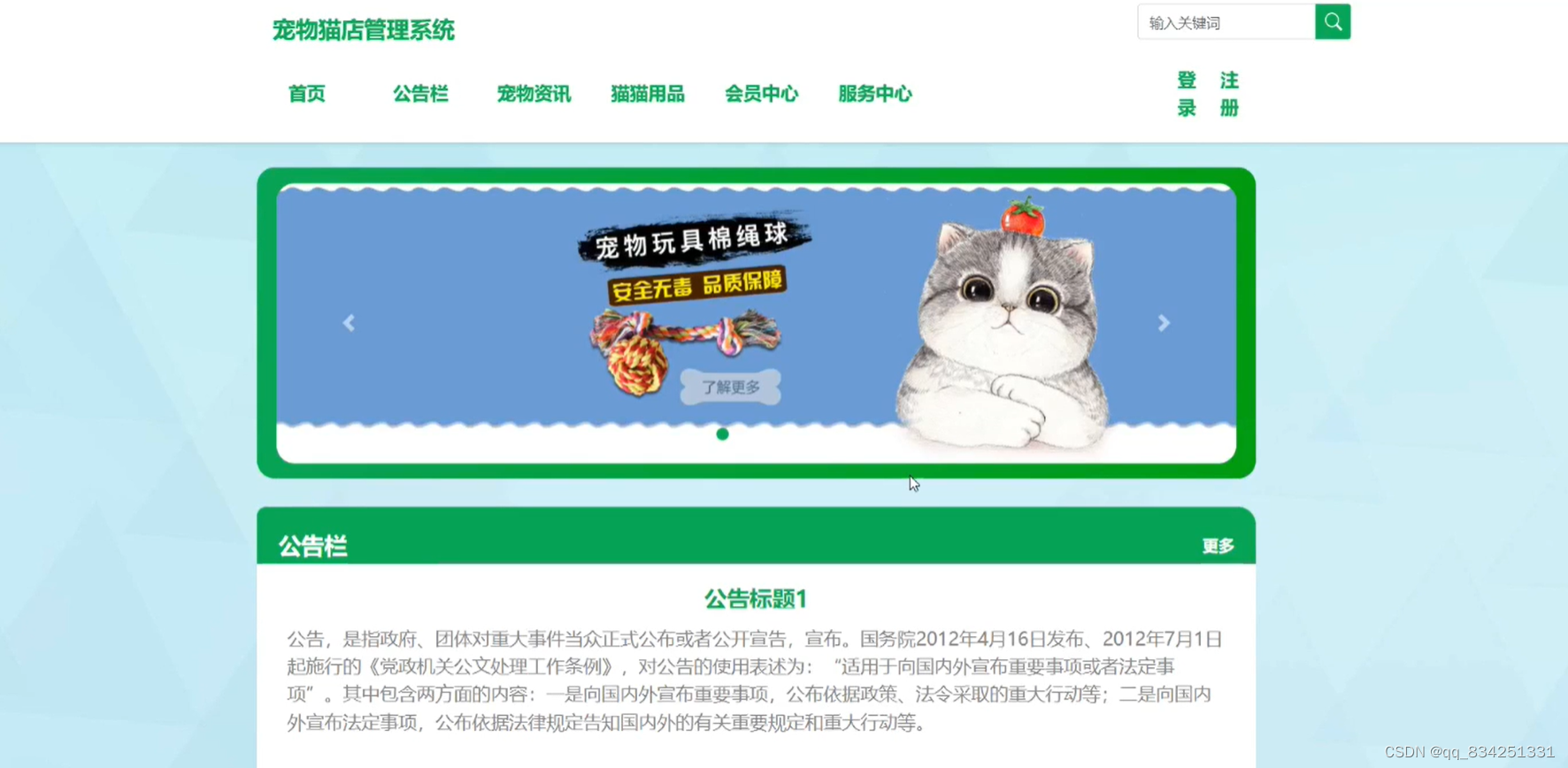 猫猫用品:用户可以浏览猫猫用品,可以自行搜索某样猫猫用品相关详情。具体功能需求如下:猫猫用品搜索:前台用户可以直接在前台输入框内输入关键词进行搜索,页面弹跳出对应猫猫用品信息。