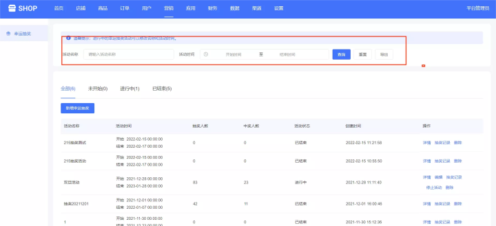 平台管理可以对结束的活动进行查看详情、抽奖记录、删除等操作,对进行中的抽奖活动可以修改名称和活动时间和停止活动等,如下图所示: