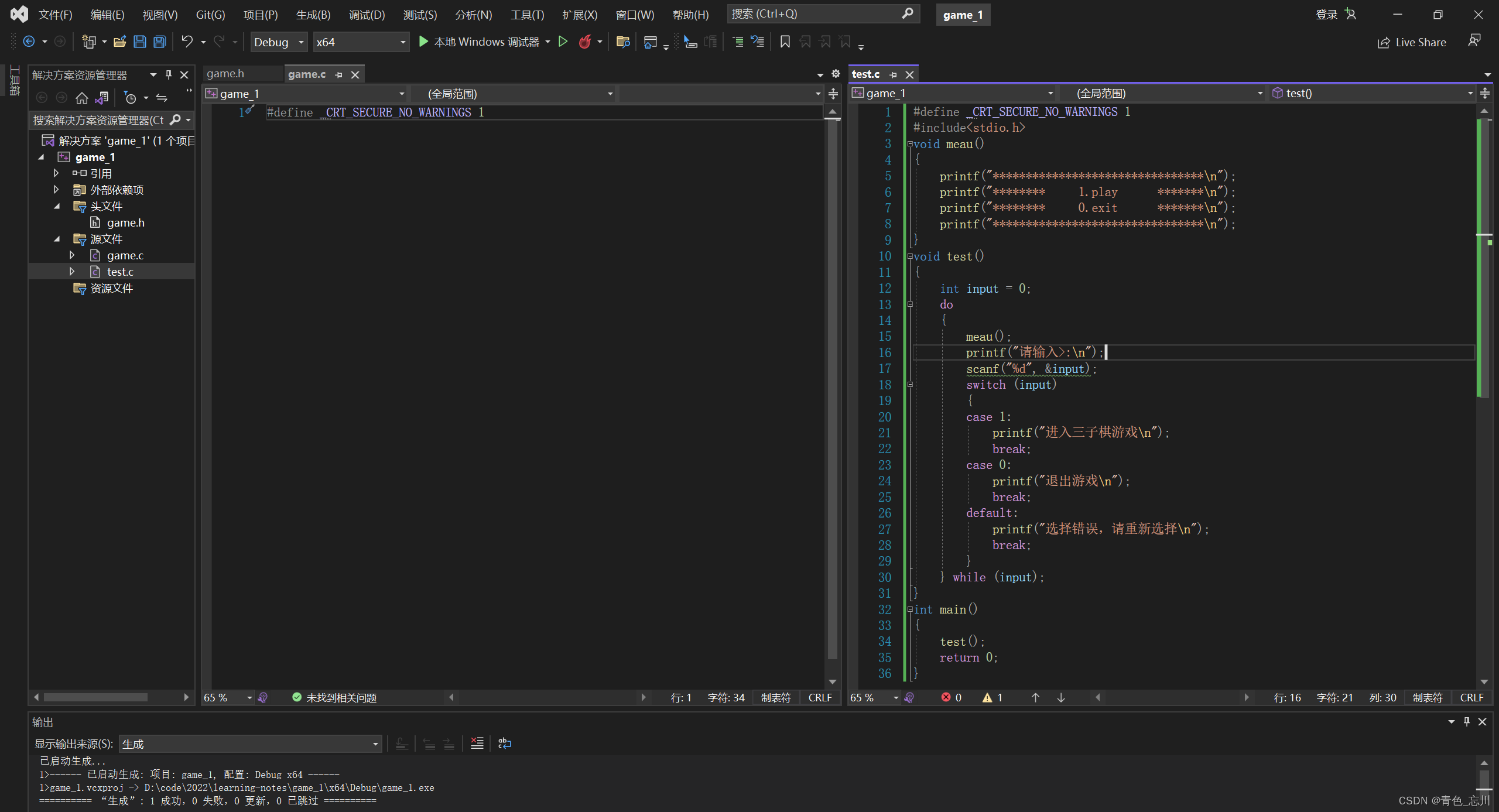 1.在我们的case 1下加上我们的游戏函数且定义和声明好我们的函数