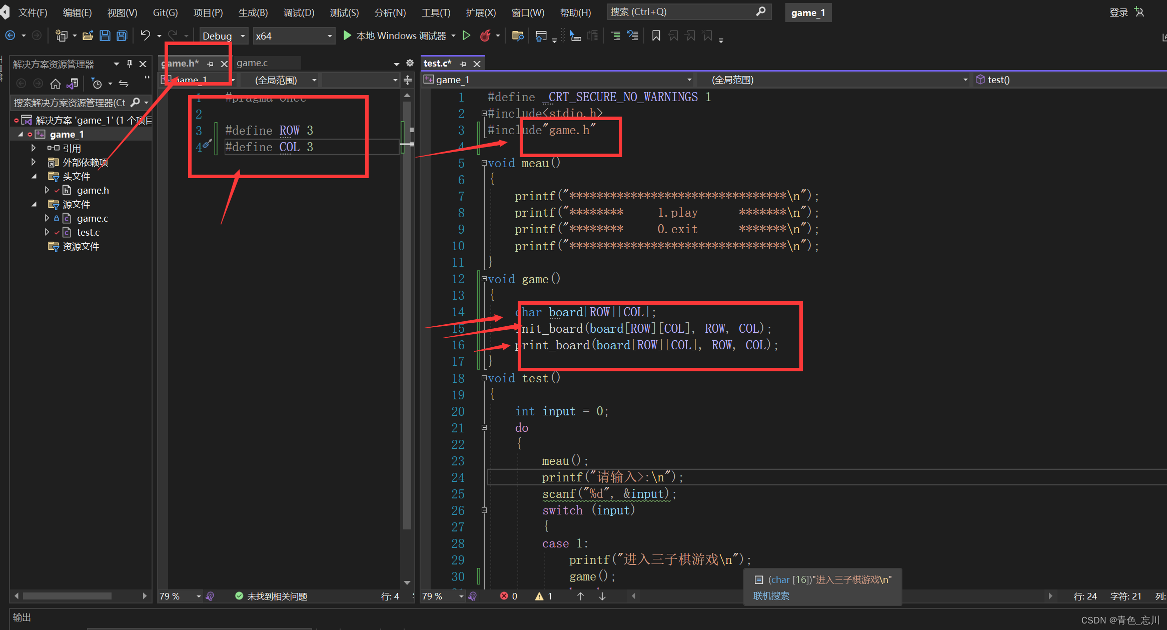 当然我们这样设计这些函数,我们其实就把代码写死了。 未来我们想要打印一个5行5列的数组就修改比较麻烦。所以我们可以这样做,使用一个define,如下图所示,我们在game.h中将ROW,和COL都设置为3。然后我们在test.c中就可以引入game.h这个头文件。将game这个函数里面的3都可以改为行和列了。这样未来我们在想进行一些修改的时候就很简单了。