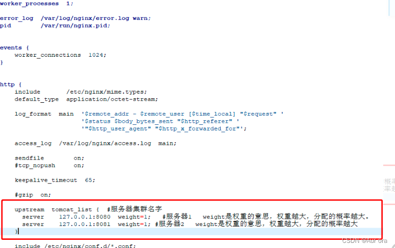 server 127.0.0.1:8081 weight=1; #服务器2 weight是权重的意思,权重越大,分配的概率越大