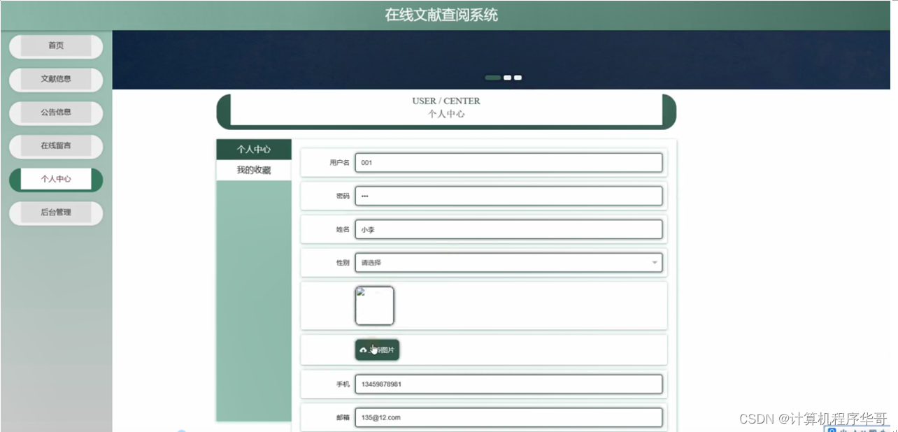 个人中心,在个人中心页面通过填写用户名,密码,姓名,性别,上传图片,手机,邮箱等内容进行更新信息,根据需要对我的收藏进行详细操作,如图5-5所示。