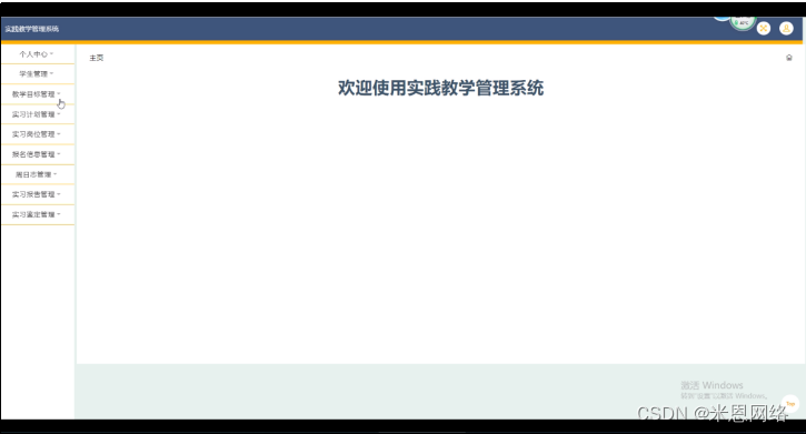 管理员登录系统后,可以对主页,个人中心,学生管理,指导老师管理,教学目标管理,实习计划管理,实习岗位管理,报名信息管理,周日志管理,实习报告管理,实习鉴定管理等功能进行相应的操作管理,如图5-2所示。