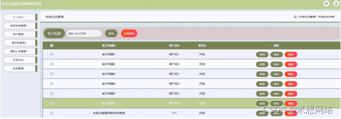 环保论坛,在环保论坛管理页面可以对帖子标题,用户名,状态等内容进行查看,修改和删除等操作,如图5-12所示。