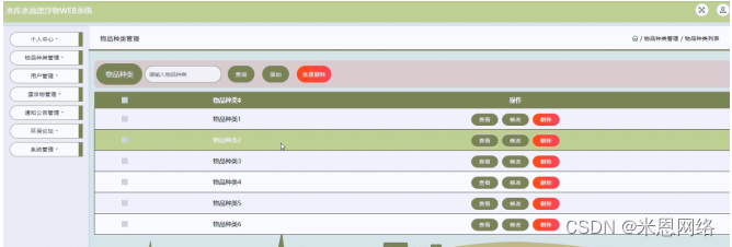 物品种类管理,在物品种类管理页面可以对物品种类内容进行查看,修改和删除等操作,如图5-8所示。