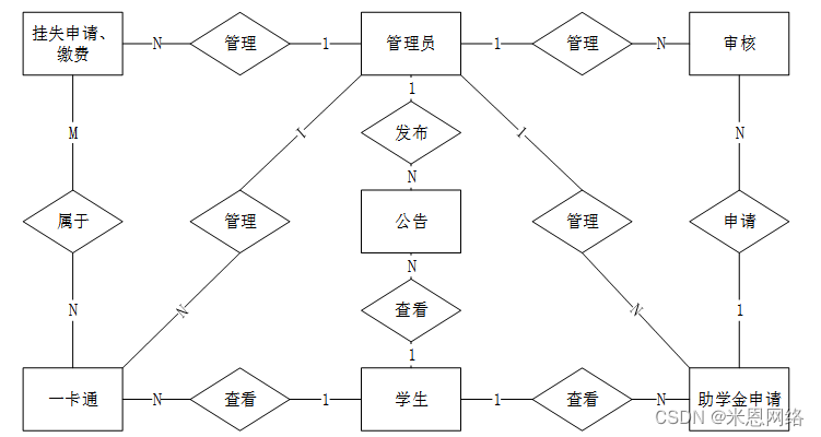 根据分析,系统中主要存在以下几个实体:管理员、学生、公告信息、一卡通信息、缴费信息、挂失申请信息、缴费信息、助学金申请信息,它们之间的E-R图如图4-5所示。
