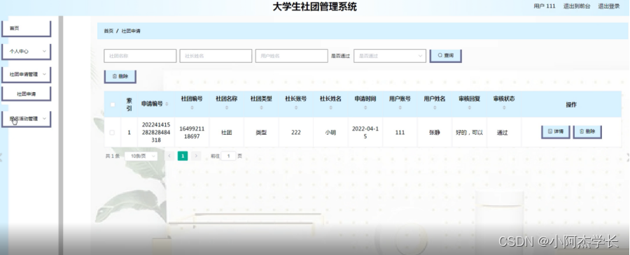 社团申请管理,在社团申请管理页面通过查看申请编号、社团编号、社团名称、社团类型、社长账号、社长姓名、申请时间、用户账号、用户姓名、审核回复、审核状态等信息进行详情、删除等操作,如图5-16所示。