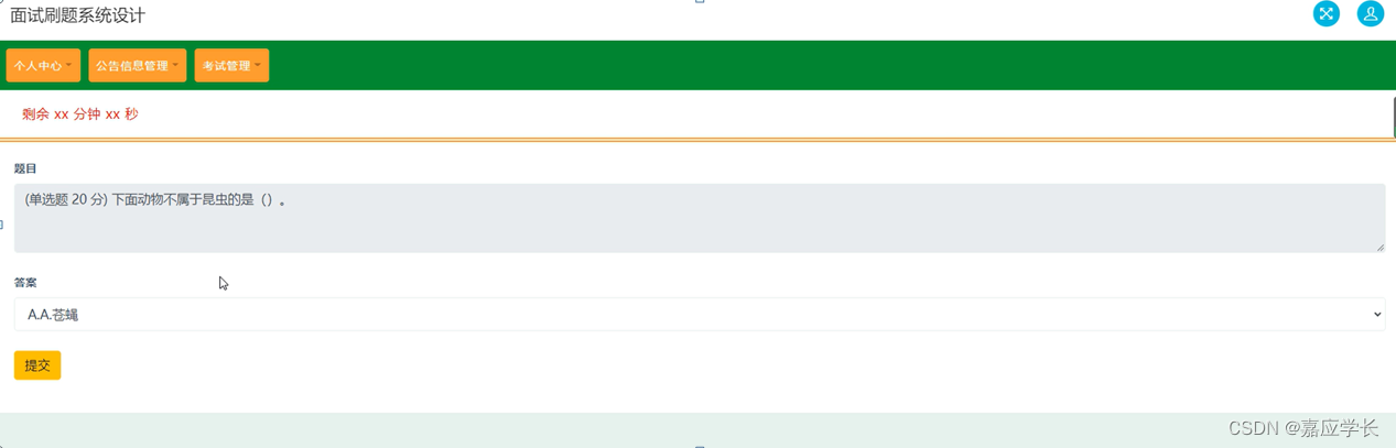 用户登录到系统,可以个人中心、公告信息管理、考试管理这三大功能模块进行操作;用户功能页面如图5-3所示。