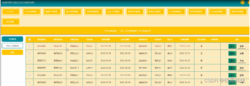 出行申请管理,在出行申请管理页面可以对居民账号,居民姓名,家庭住址,出发地,返回日期,出发日期,途径地点,目的地,备注,申请日期,是否审核,审核回复等内容进行审核,查看等操作,如图5-9所示。