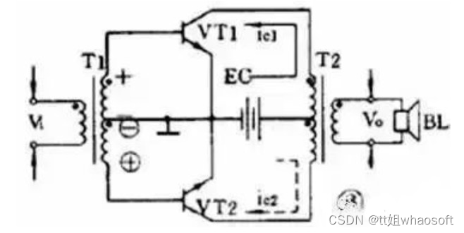 它由两个特性相同的晶体管组成对称电路,在没有输入信号时,每个管子都处于截止状态,静态电流几乎是零,只有在有信号输入时管子才导通,这种状态称为乙类工作状态。当输入信号是正弦波时,正半周时 VT1 导通 VT2 截止,负半周时 VT2 导通 VT1 截止。两个管子交替出现的电流在输出变压器中合成,使负载上得到纯正的正弦波。这种两管交替工作的形式叫做推挽电路。