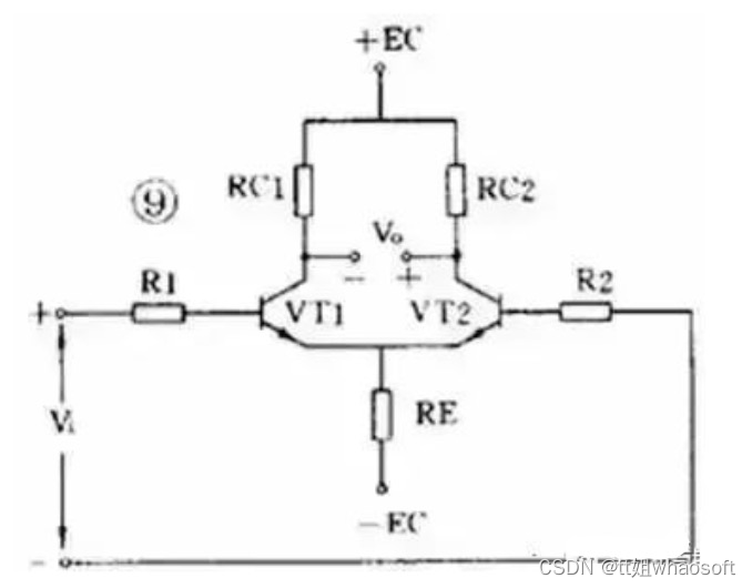 解决零点漂移的办法是采用差分放大器,下图是应用较广的射极耦合差分放大器。它使用双电源,其中 VT1 和 VT2 的特性相同,两组电阻数值也相同, R E 有负反馈作用。实际上这是一个桥形电路,两个 R C 和两个管子是四个桥臂,输出电压 V 0 从电桥的对角线上取出。没有输入信号时,因为 RC1=RC2 和两管特性相同,所以电桥是平衡的,输出是零。由于是接成桥形,零点漂移也很小。差分放大器有良好的稳定性,因此得到广泛的应用。