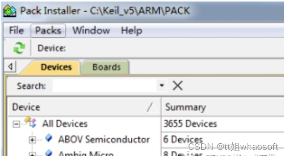 下载KEIL MDK5以后是没有安装device的,如果此时创建工程会找不到目标芯片,如下图所示:
