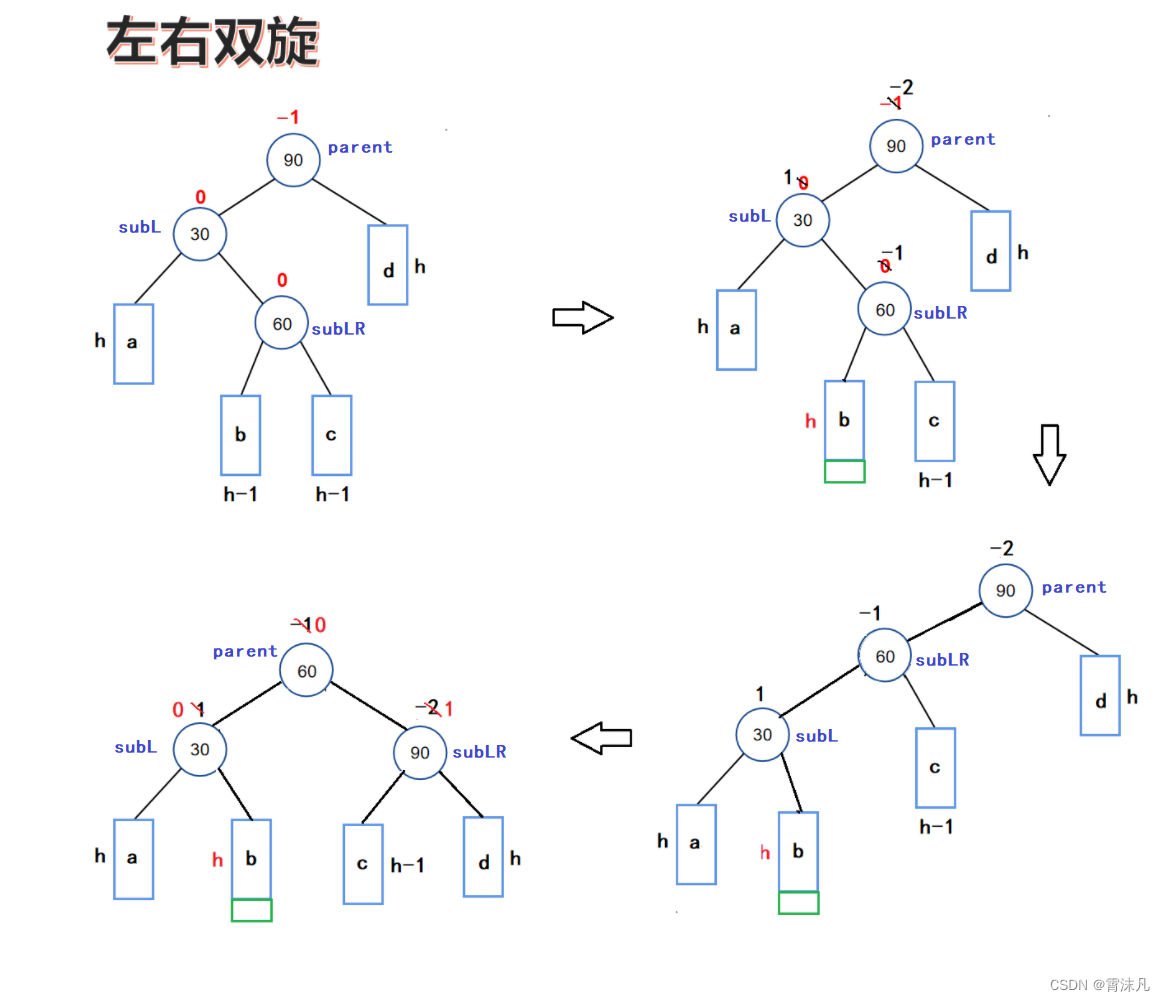 情况4:当parent的平衡因子为-2,cur的平衡因子为1时,进行左右双旋