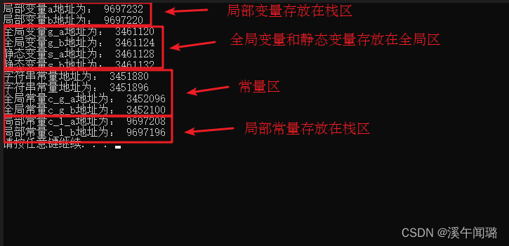 全局区还包含了常量区, 字符串常量和其他常量也存放在此.